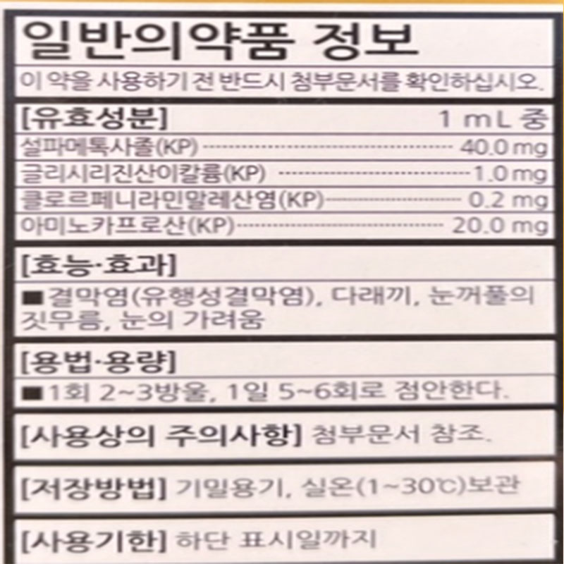 안약 성분으로 설파메톡사솔, 글리시리진산이칼륨, 클로르페니라민말레산염, 아미노카프로산 같은 성분으로 다른 약품도 사용하여도 됩니다.