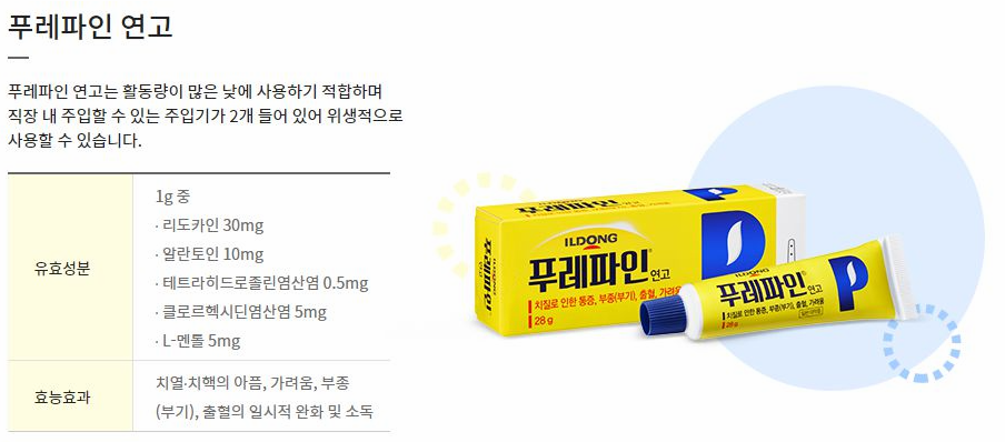 푸레파인 연고로 성분은 리도카인, 알란토인, 테트라히드로졸린염산염, 클로르헥시딘염산염, L-멘톨의 성분이 있습니다. 성능은 치열, 치핵의 아픔, 가려움, 부종, 출혈의 일시적 완화와 소독 기능이 있습니다.